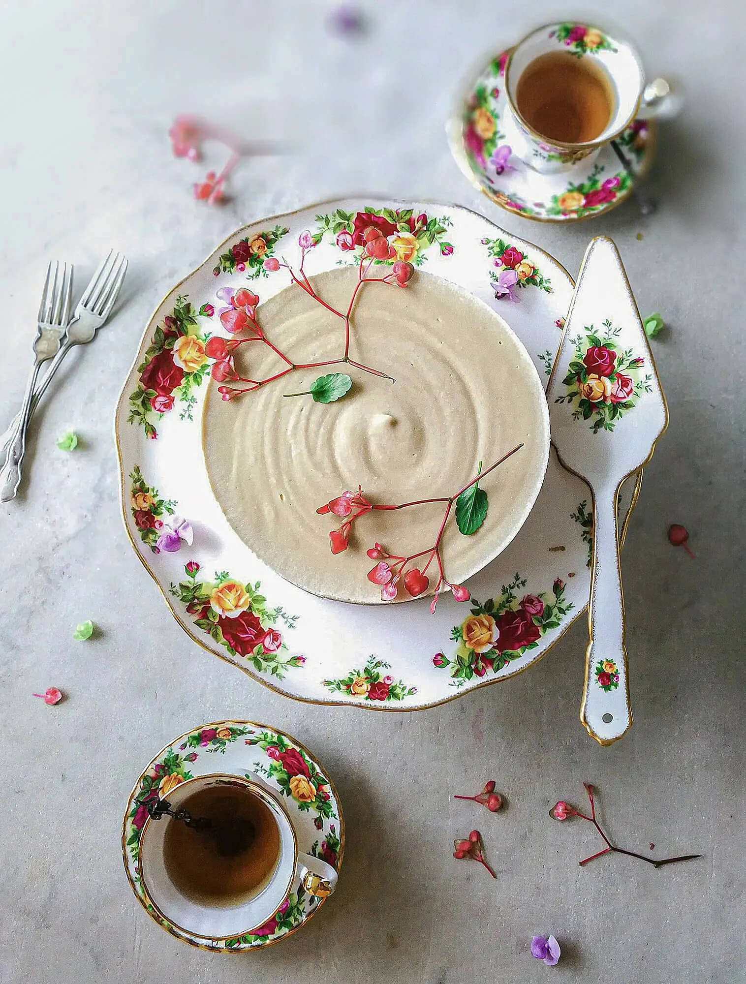 С переходом на костяной фарфор эстетика Royal Albert не изменилась — новый материал лишь усилил её. Он давал более гладкую и светлую поверхность, на которой цветочные узоры выглядели чётче, а позолота — ярче. Повышенная прочность материала позволяла делать тонкие стенки и изящные формы, что идеально подходило для романтичного стиля бренда.