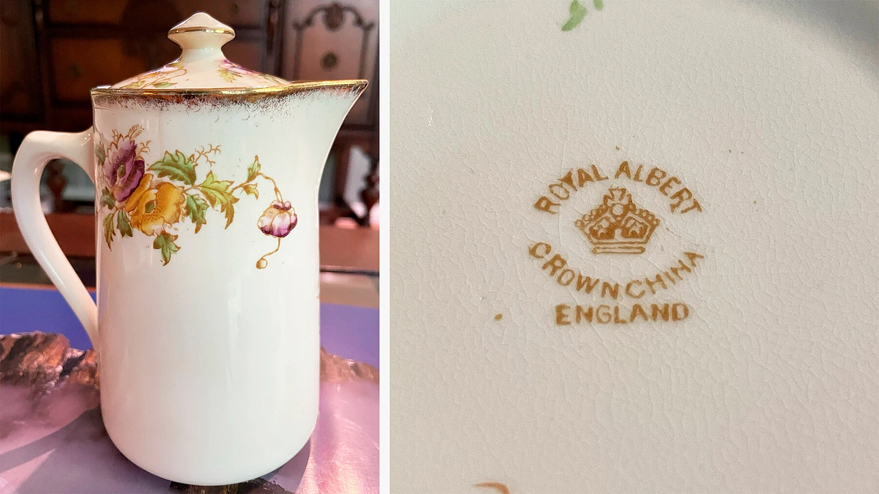 Ранние изделия Albert Crown China можно узнать по характерным клеймам: декоративная корона, название фабрики и отметка «Longton» или «England». Такие маркировки встречаются на предметах конца 19 — начала 20 века и сегодня ценятся коллекционерами как ранние изделия бренда.