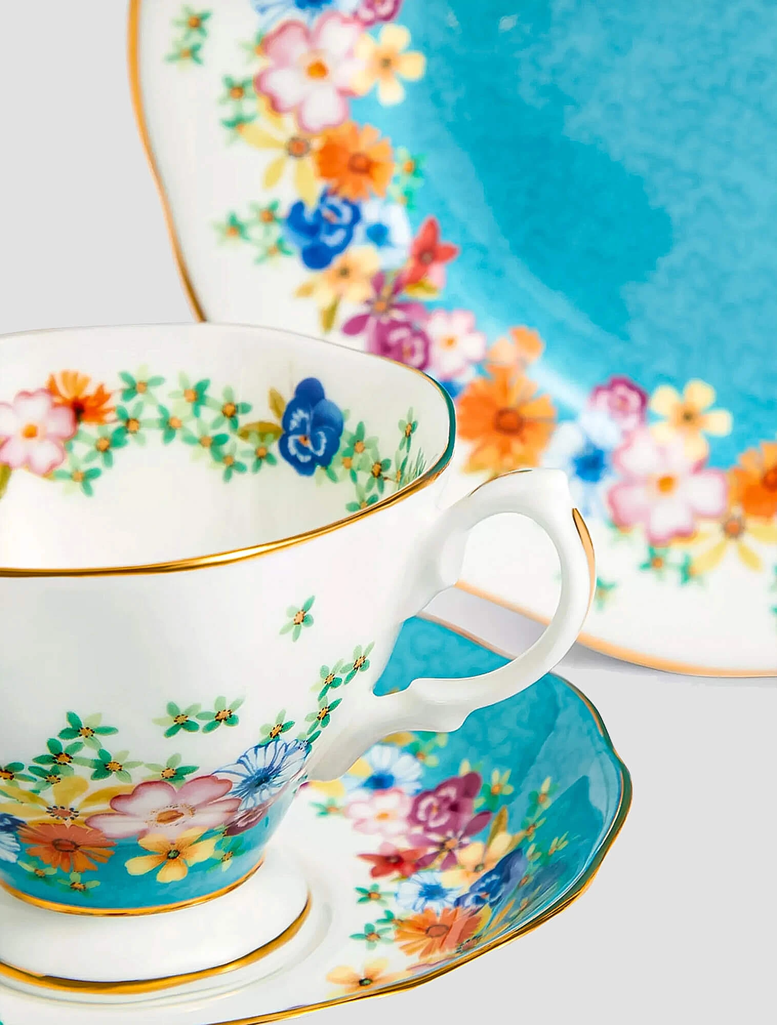 Во второй половине 40-х появляются более смелые, жизнерадостные мотивы — Serena и Corncockle. На их основе был создан этот дизайн. По краю бирюзовой середины тарелки, напоминающей озеро, изображён венок ярких полевых цветов. Благодаря этой серии многие покупатели заново открыли для себя историю Royal Albert как живую эволюцию стиля, который менялся вместе с эпохой.