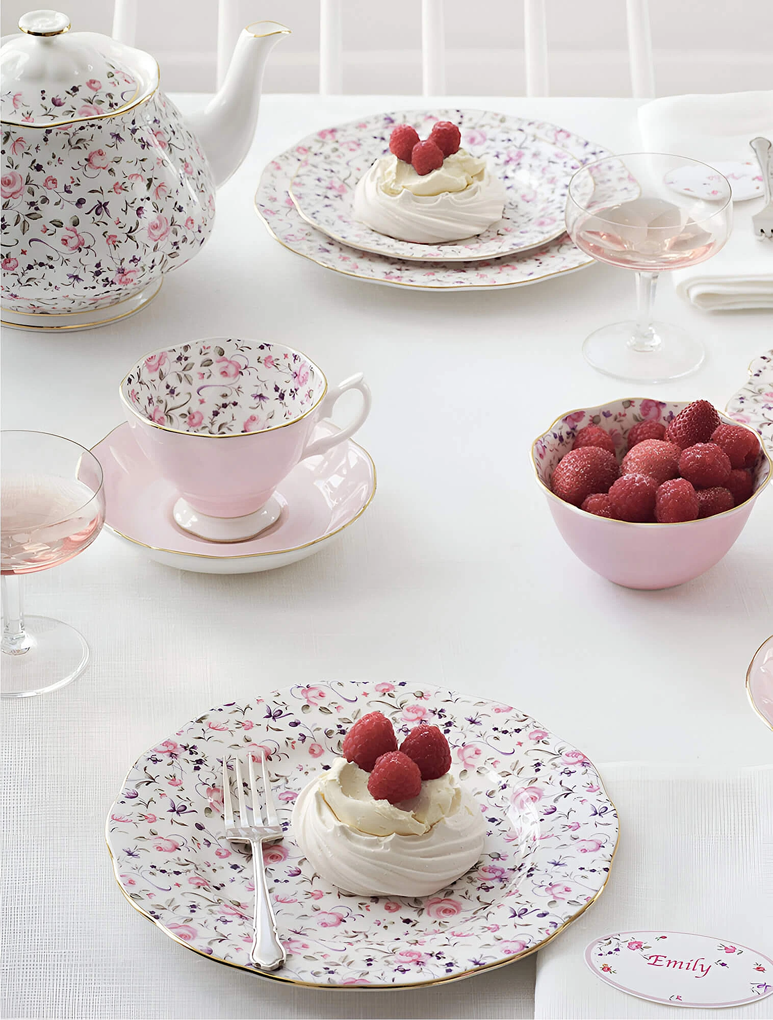 Фирменными узорами бренда были мелкие розы, полевые цветы, композиции в ботаническом стиле. Палитра — мягкая и светлая, с тонкими золотыми акцентами по краю. Формы ранних изделий создавали простыми, акцент был именно на рисунке.