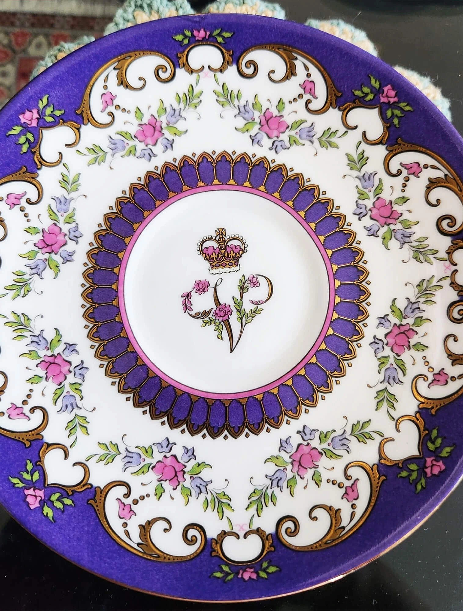Lady Carlyle стала одной из первых больших работ Холдкрофта. По краю изделий проходит розовая декоративная полоса, а в центре расположен аккуратный букет садовых цветов — роз, незабудок и мелких бутонов. Композиция обрамлена нарядными декоративными завитками и тонкими золотыми акцентами.
