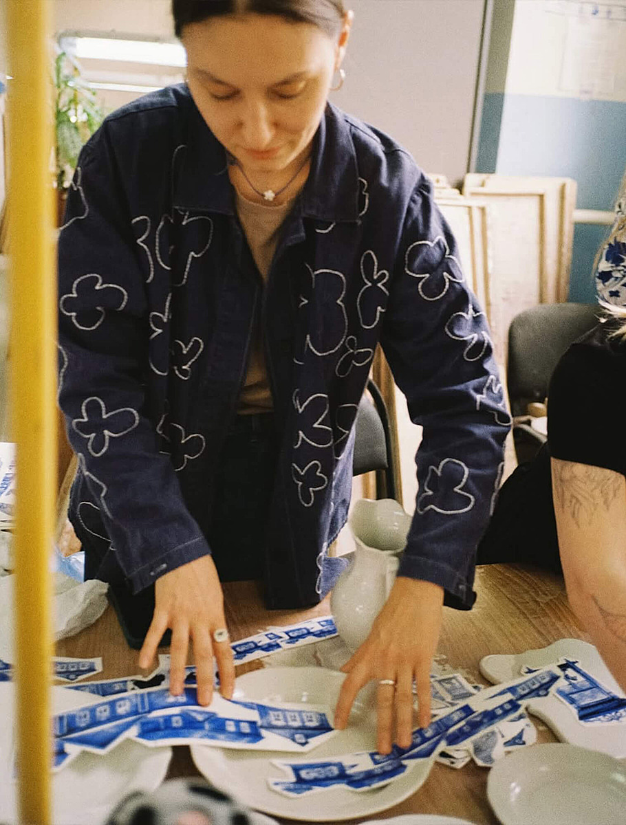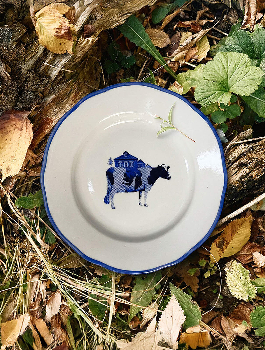 Одной из таких работ стала коллекция «Возвращение в деревню», созданная с фотографом и digital-художником Алисой Гулканян. В ней образы русской глубинки — корова, сельский дом, курица — выполнены в гжельской цветовой гамме, но с современной графической интонацией.