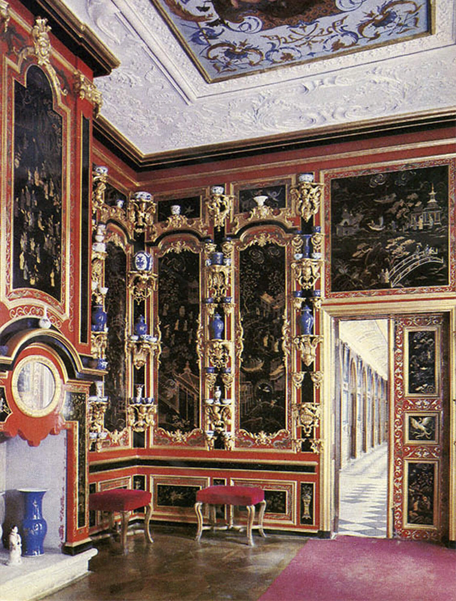 После одной из таких поездок Пётр захотел создать похожий «восточный уголок» у себя. В Петергофе во дворце Монплезир появился Лаковый кабинет, который был создан для демонстрации большой коллекции китайского фарфора.