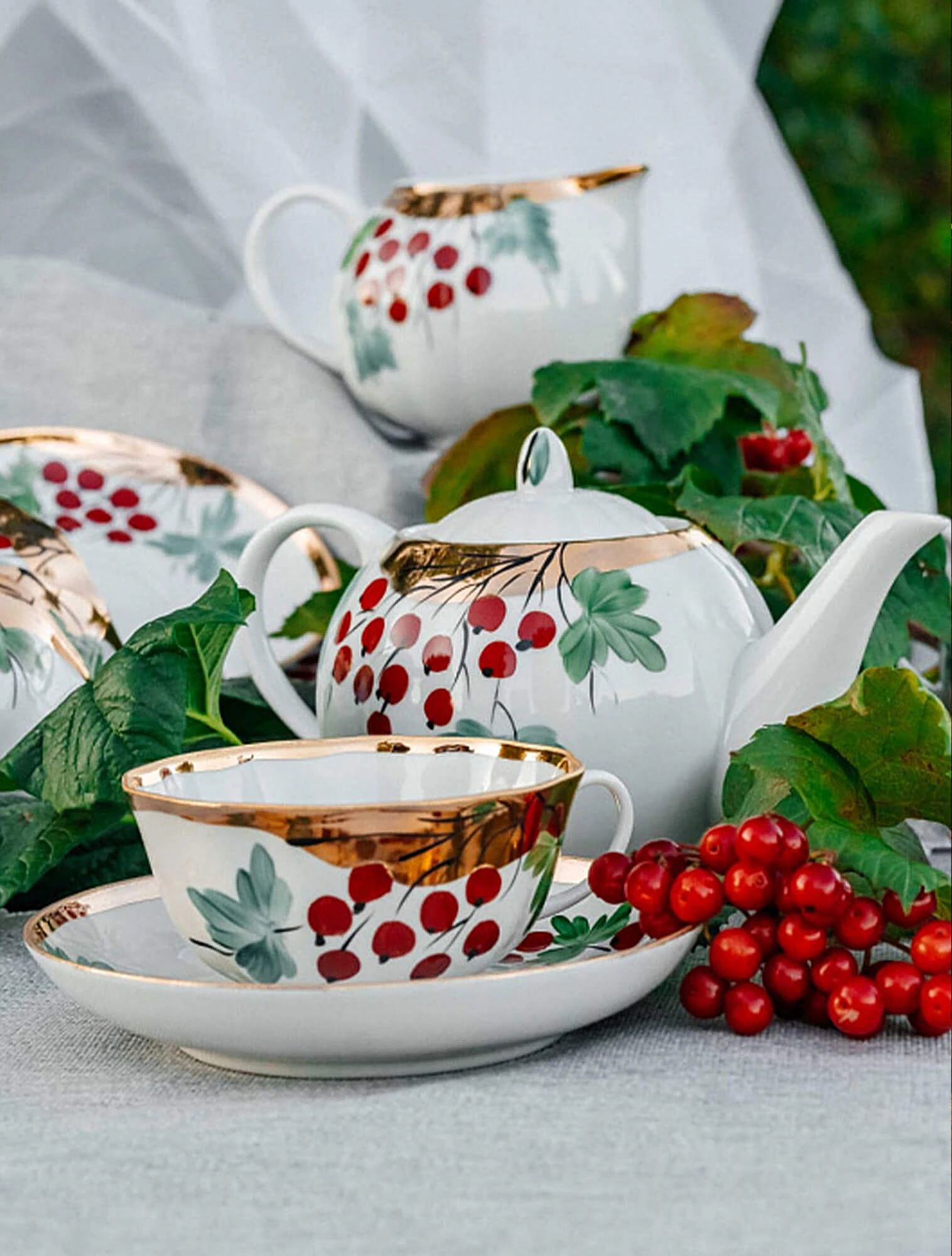 Чайные сервизы украшались букетами цветов и гирляндами. Их создавали в различных техниках: подглазурная и надглазурная роспись, печать, цветные люстры (металлизированные покрытия), золочение по рельефному узору, скульптурные элементы на крышках, ручках, подставках.