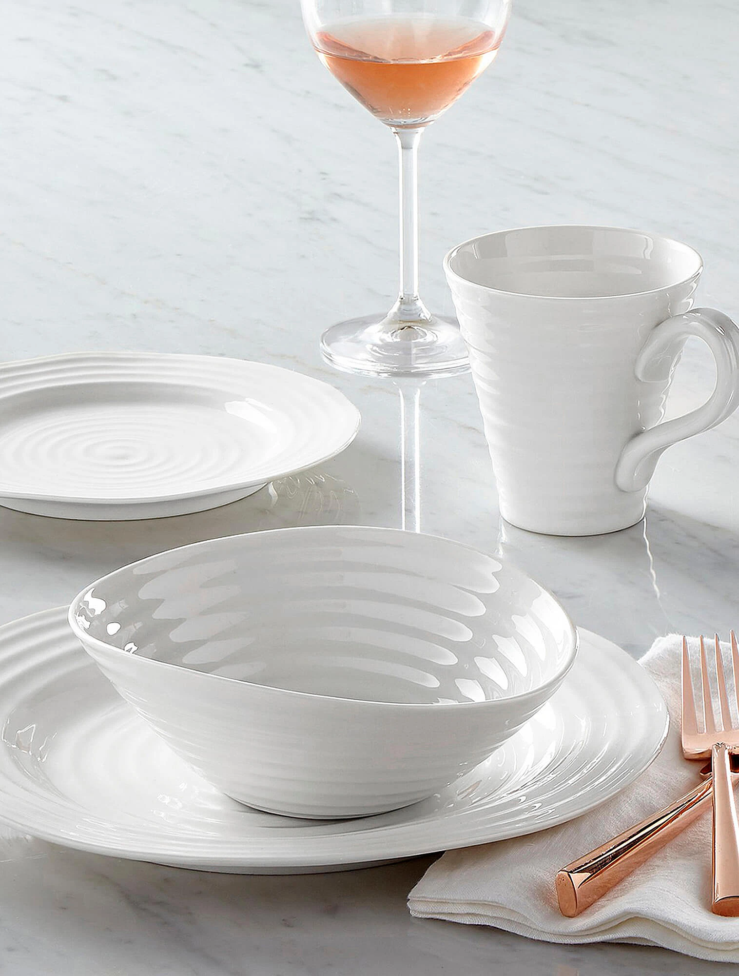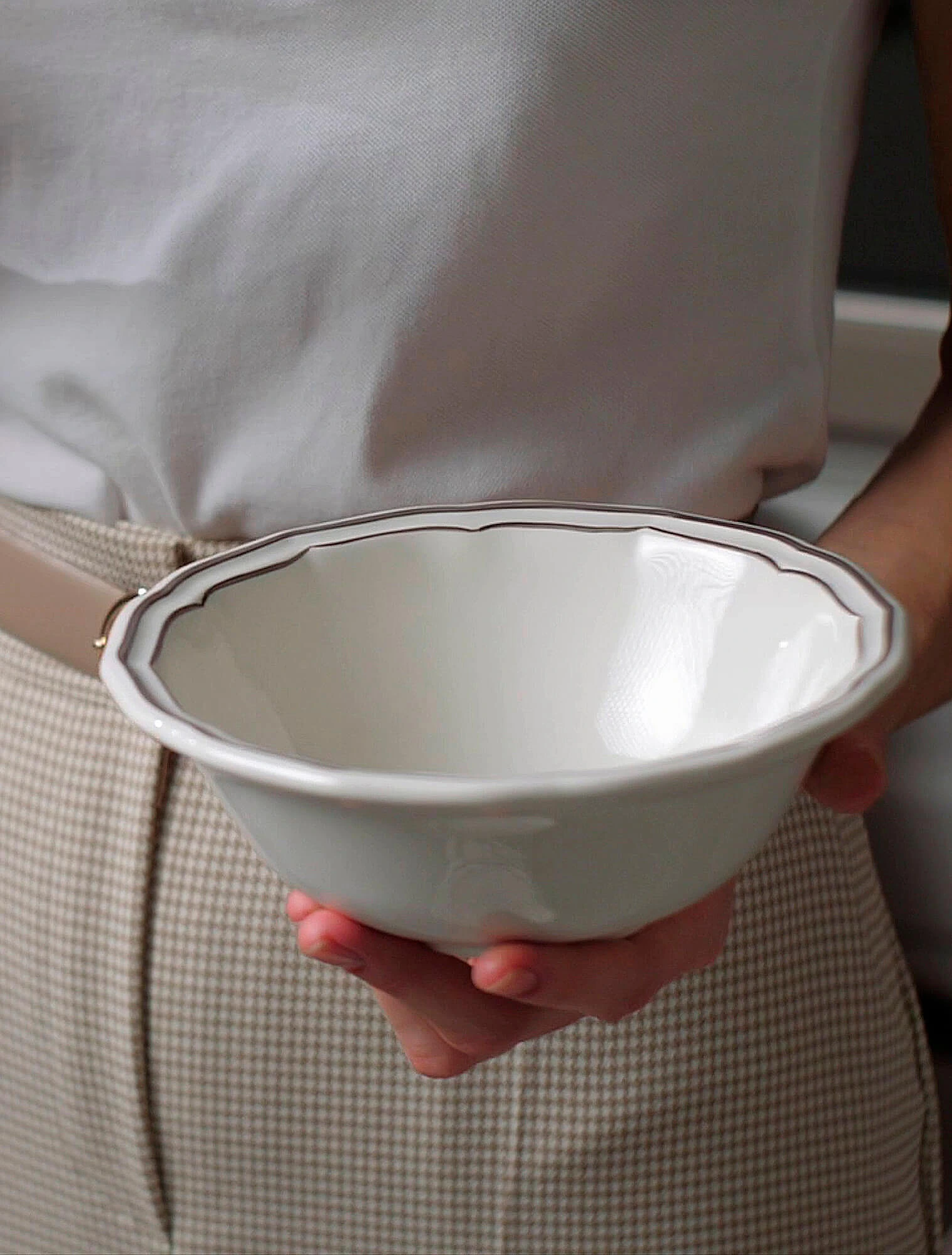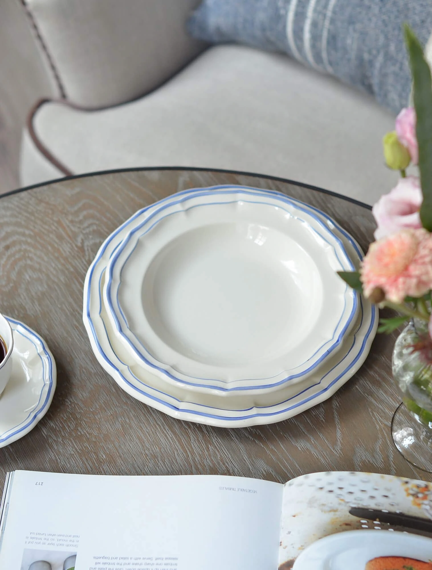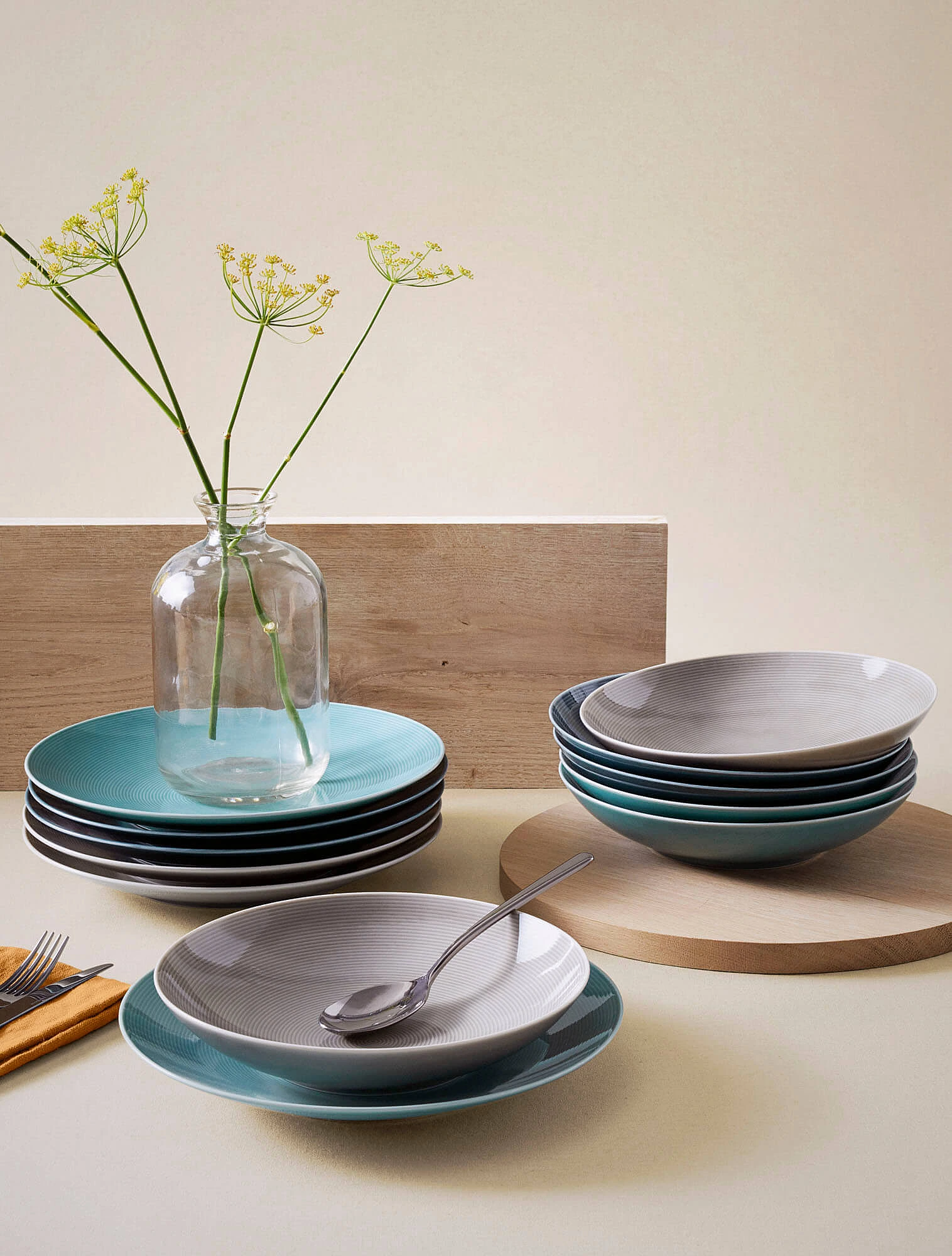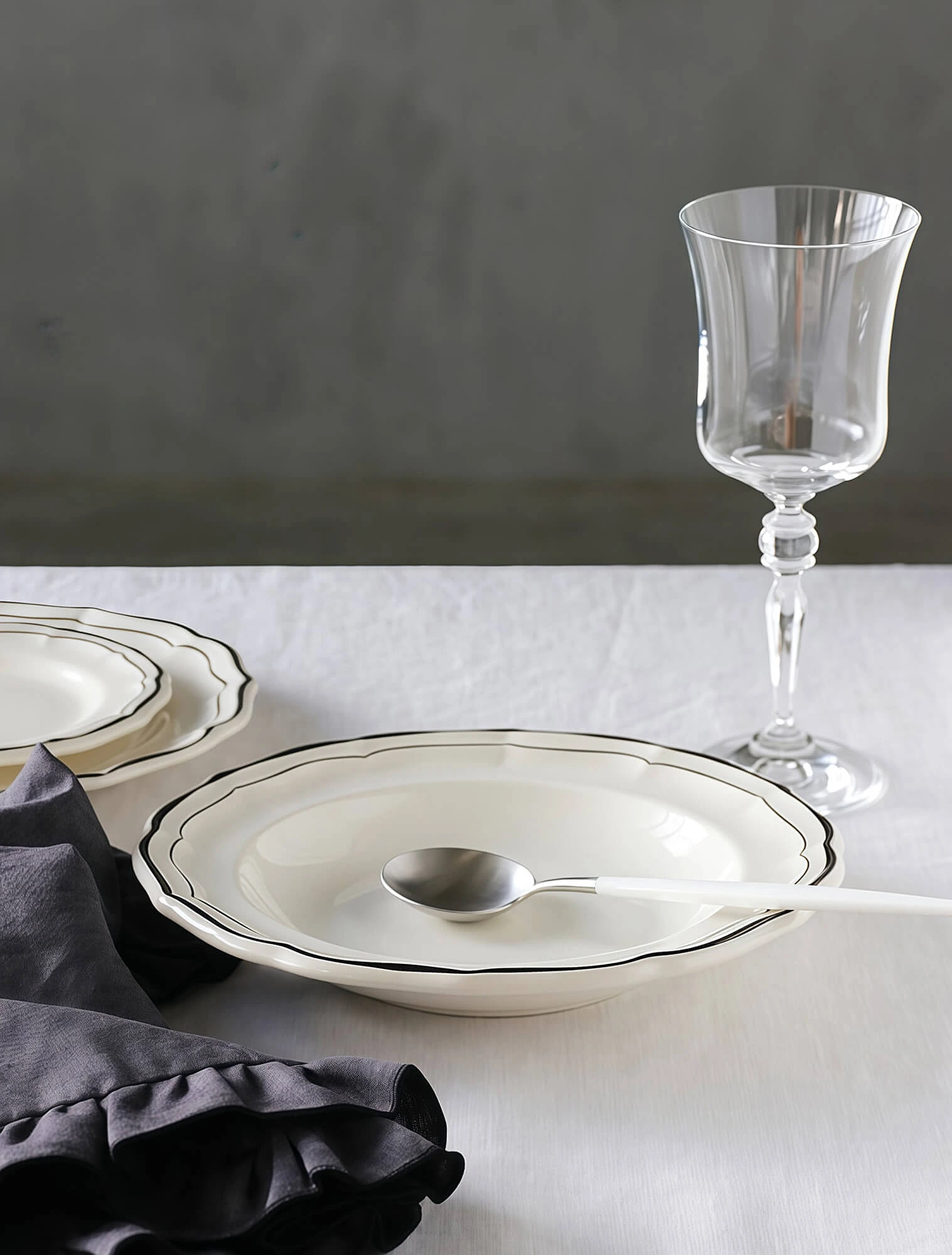 Классическую суповую тарелку с ободком, а также широкую тарелку для пасты обычно ставят на обеденную или подстановочную тарелку. Такое сочетание выглядит особенно гармонично благодаря разнице в диаметре: обеденная тарелка — около 27 см, подстановочная — 32 см, а суповая — на 4–6 см меньше. Эта пропорция создаёт визуально уравновешенную и аккуратную сервировку.