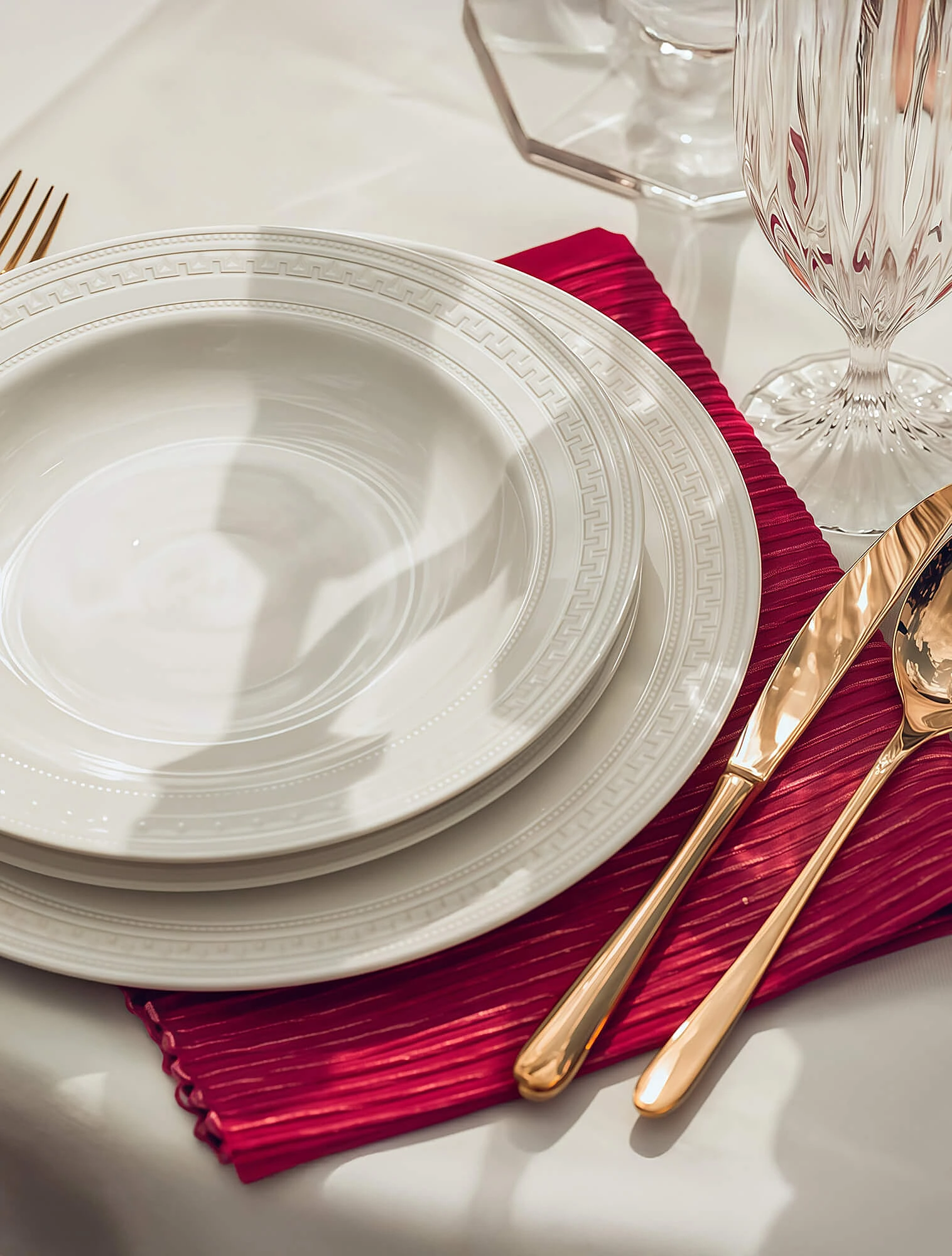Три тарелки, сложенные «горкой», — это неудобно, они могут скользить во время движений приборами, доставляя гостю дискомфорт.