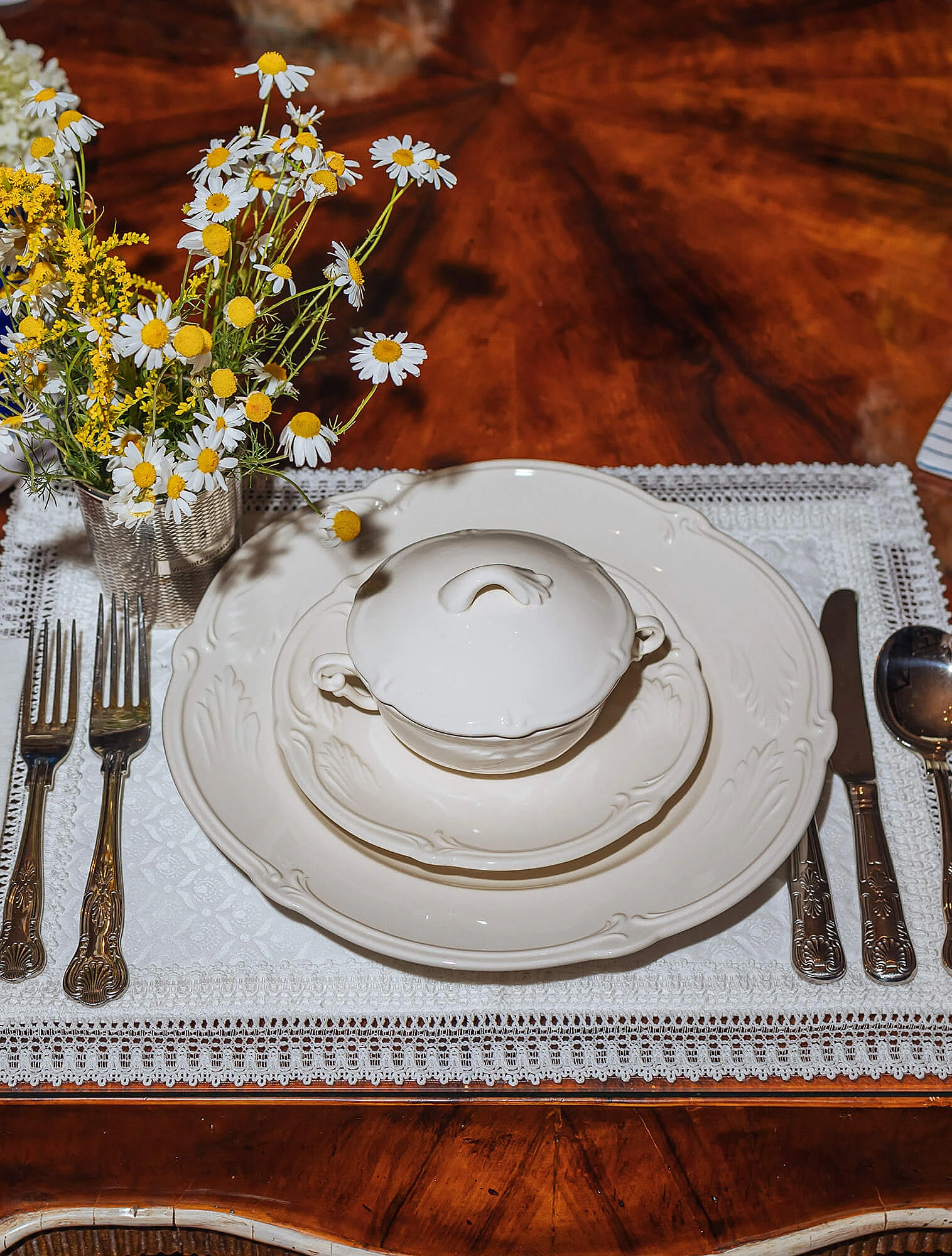 - Во время трапезы супницу держат накрытой, чтобы сохранить температуру. Перед подачей следующего блюда её уносят со стола вместе с половником и подставкой.