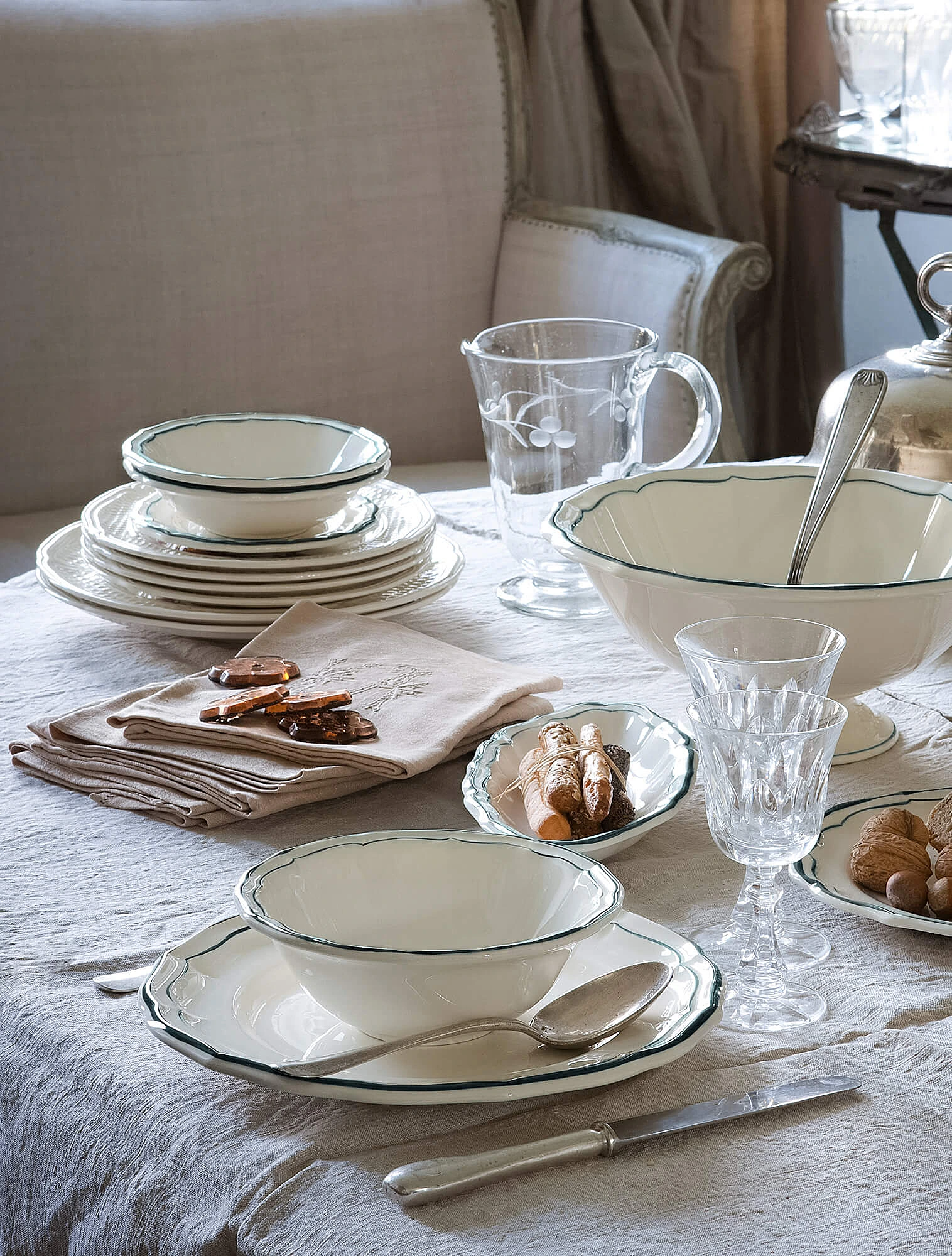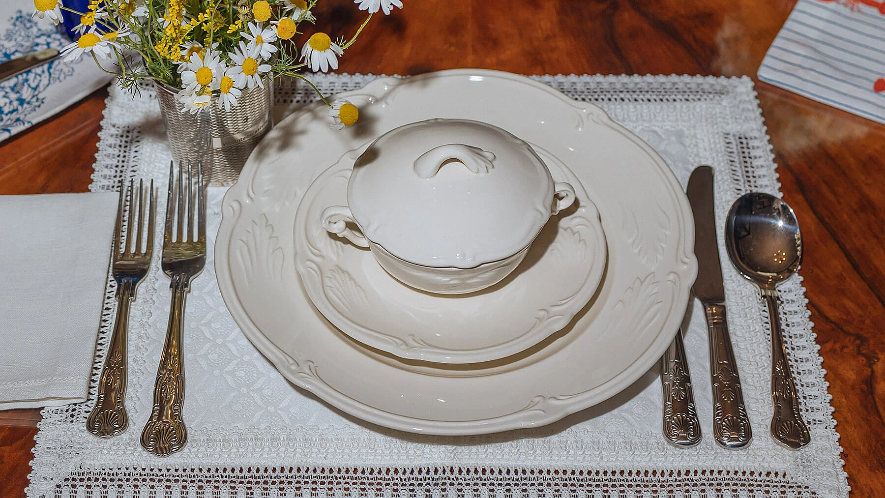 Помимо эстетической функции, подстановочная тарелка выполняет и практическую: она защищает скатерть от крошек, капель и контакта с горячей посудой.