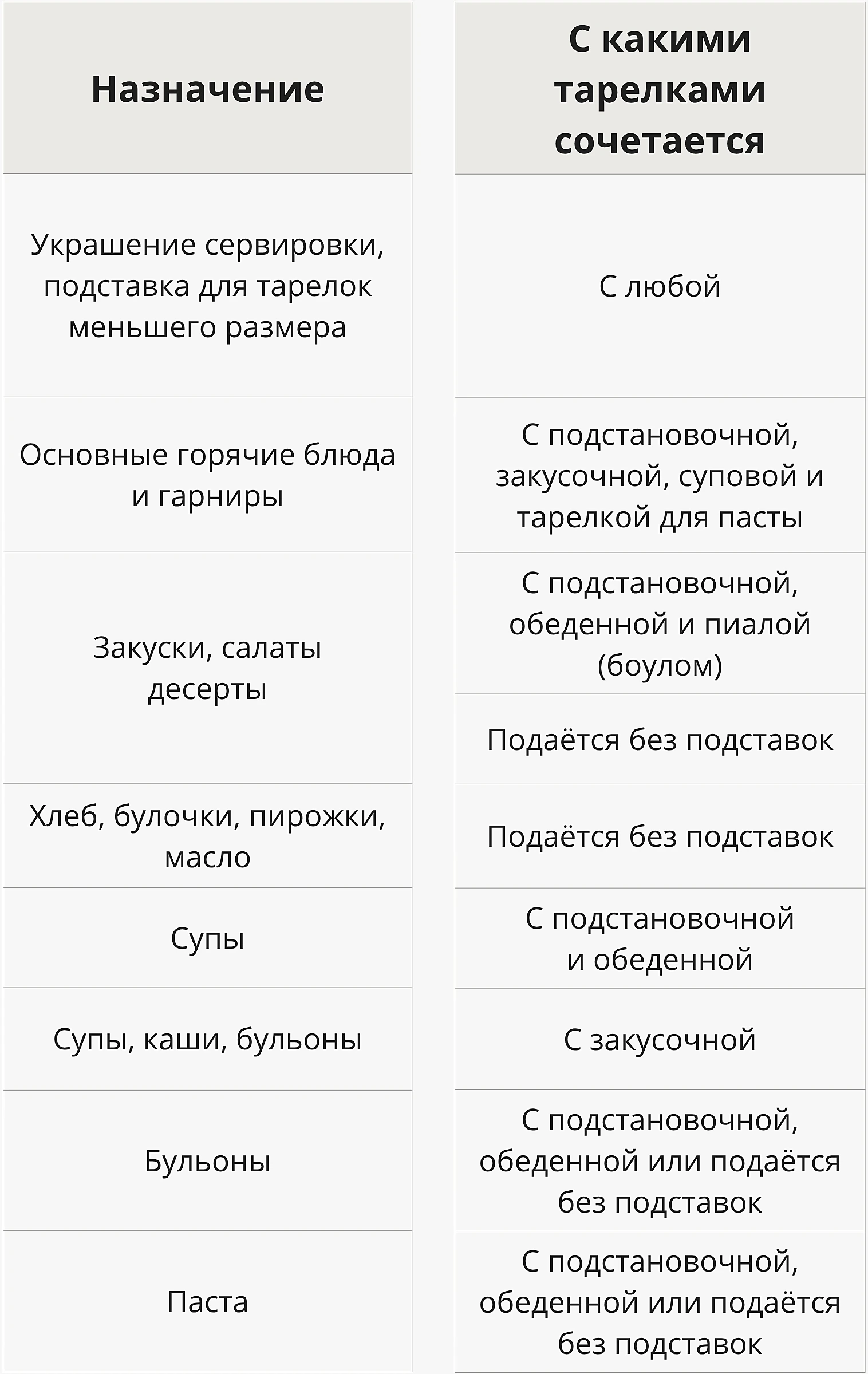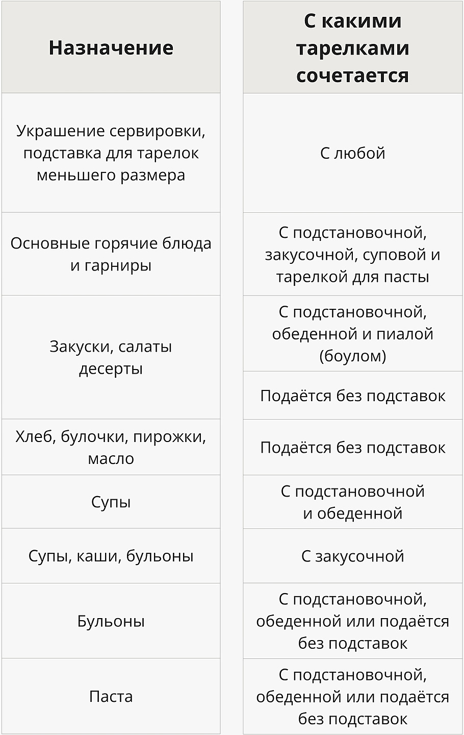Основные виды тарелок для сервировки с главными характеристиками, размерами и оптимальными сочетаниями мы собрали в таблице: