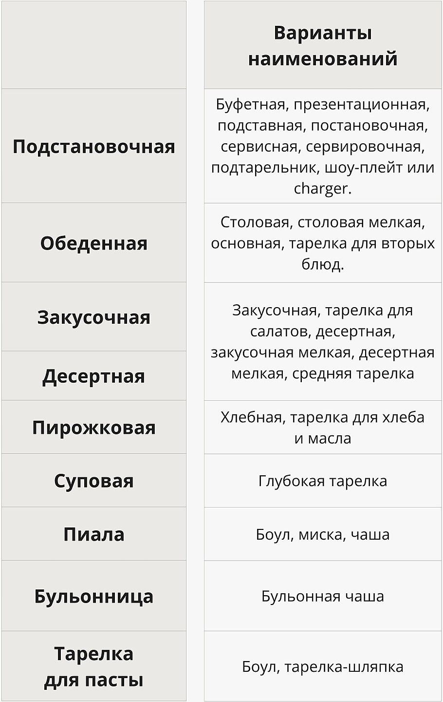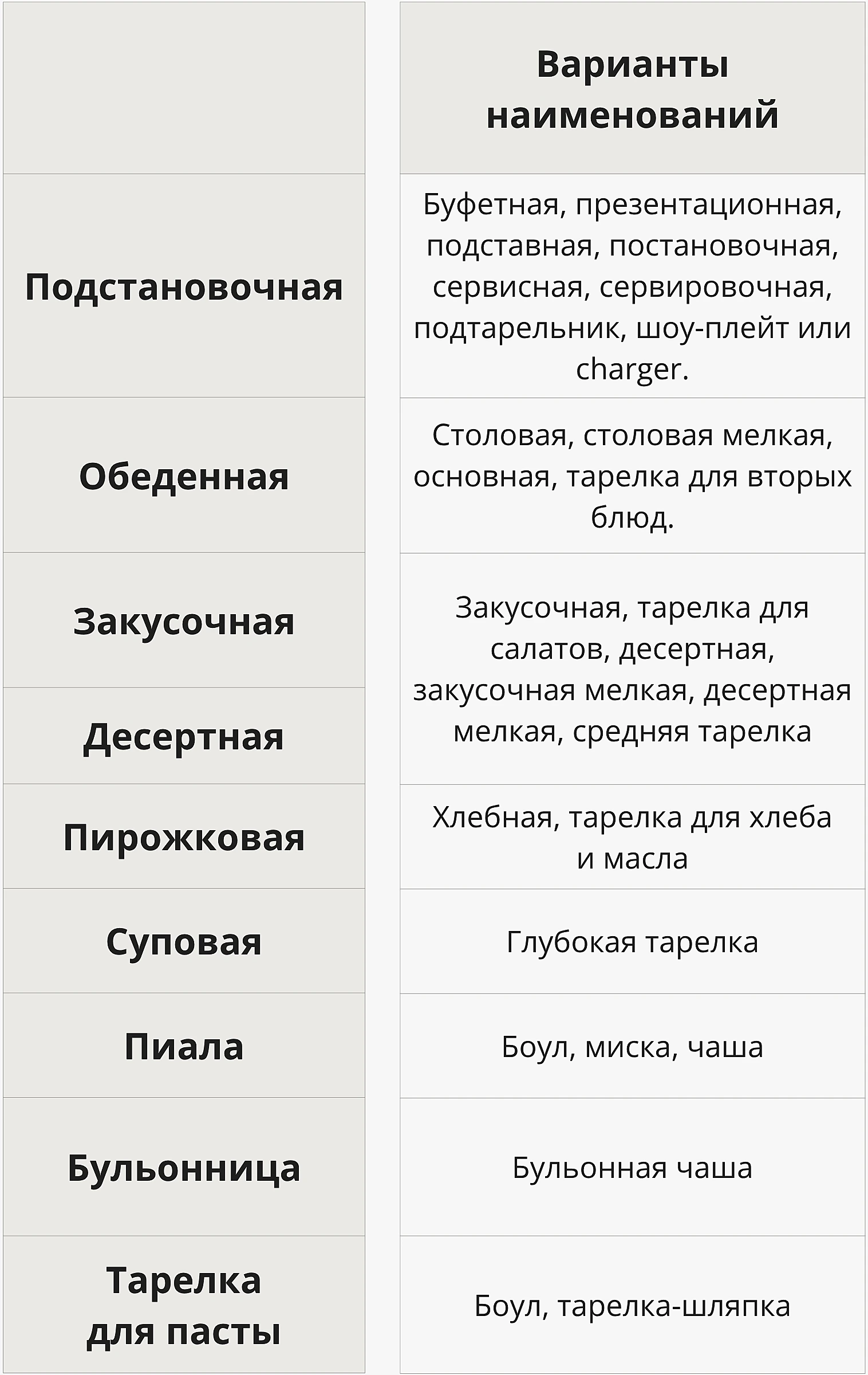 Общая классификация тарелок для сервировки стола