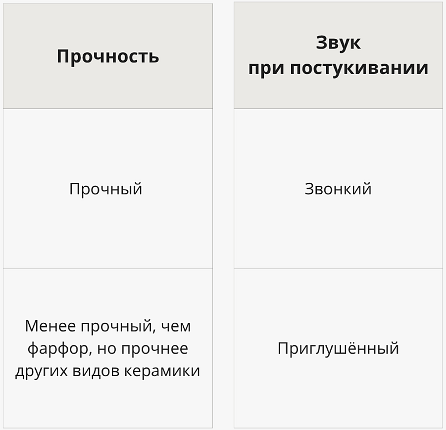 Толщиной и весом. Фаянсовая посуда тоньше и легче, чем другие виды керамики. Она также отличается меньшим водопоглощением. При этом фаянс, как правило, массивнее фарфора. Но здесь могут быть исключения.