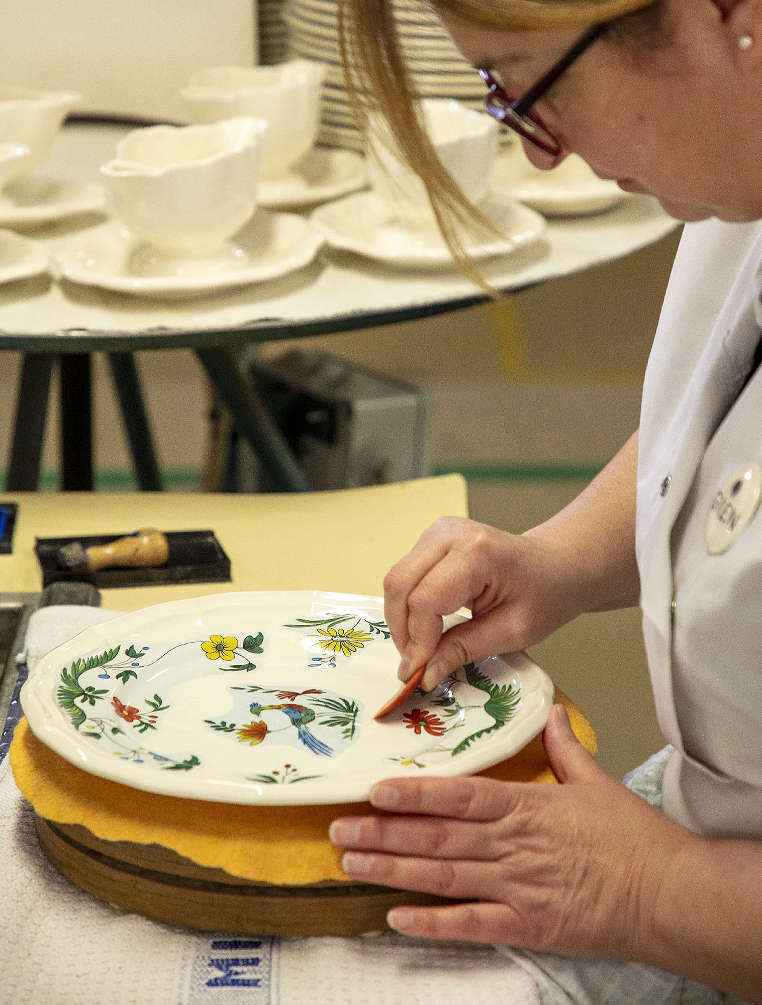 Декорируют посуду до или после покрытия глазурью. В первом случае рисунок сначала не видно под слоем глазури: он проявится только после того, как выйдет из печи после второго обжига.
