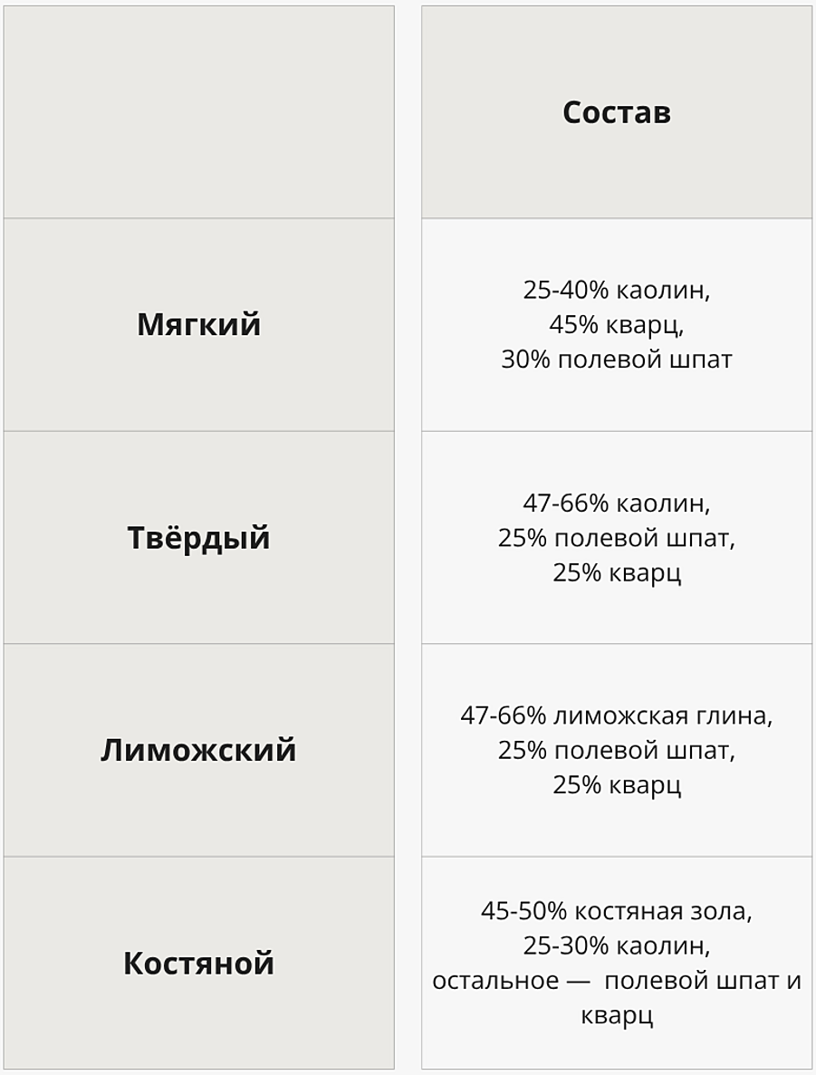 Это один из самых прочных материалов, используемых для изготовления посуды. Его классический состав включает каолин (белую глину), полевой шпат и кварц. Их соотношение может меняться в зависимости от бренда или разновидности фарфора. Но, как правило, каолина содержится около 50%, а кварца и полевого шпата около 25%.