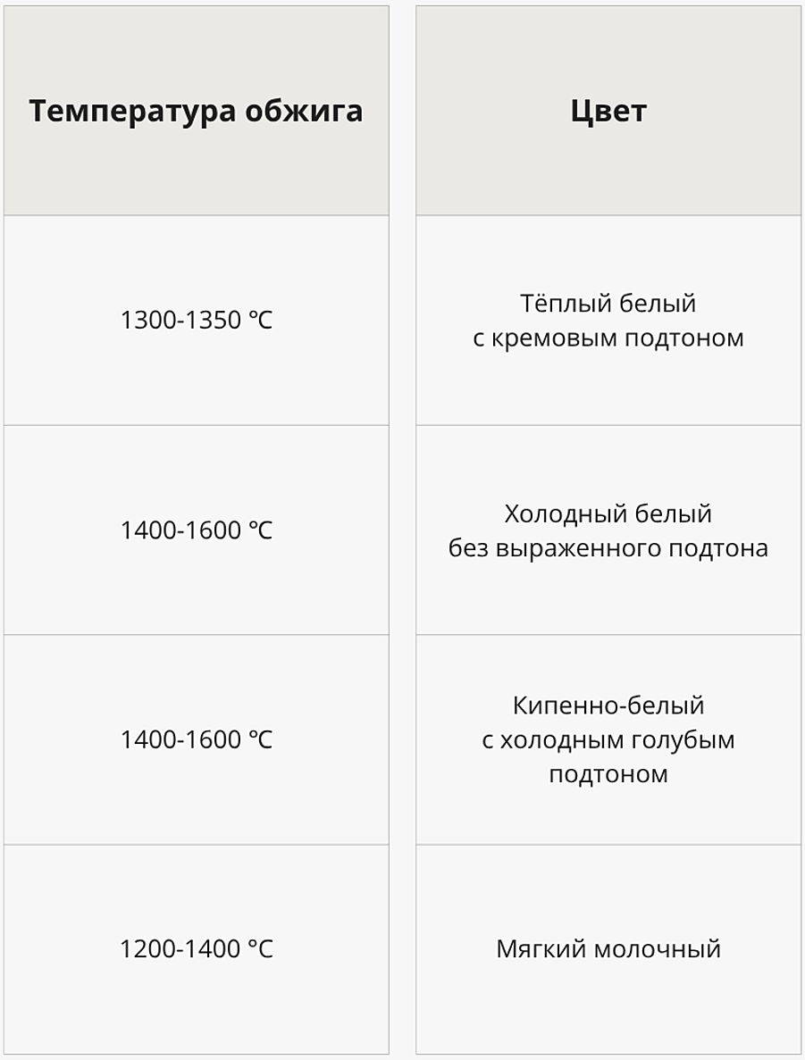 Фарфор изначально белый. Все виды фарфора в исходном виде (без глазури) белые, но могут иметь разные оттенки. У твёрдого фарфора холодный подтон, а у мягкого и костяного — более тёплый молочный оттенок.